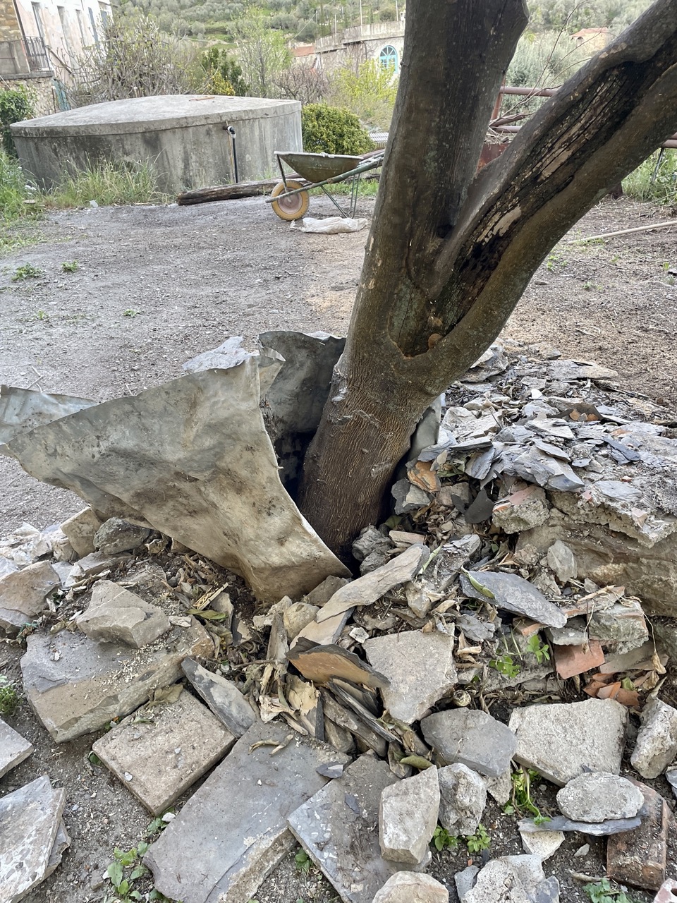 Vi börjar röja rejält i trädgården och plockar bort all sten och den märkliga plåten som låg runt apelsin-trädet. Den plåten byggde Nora en kryddlåda av för att hänga på balkongen. Vi hängde tillbaka luckorna och Mauro kom förbi med ett stort vinfat. Det ska fungera som vattensamlare på gaveln.