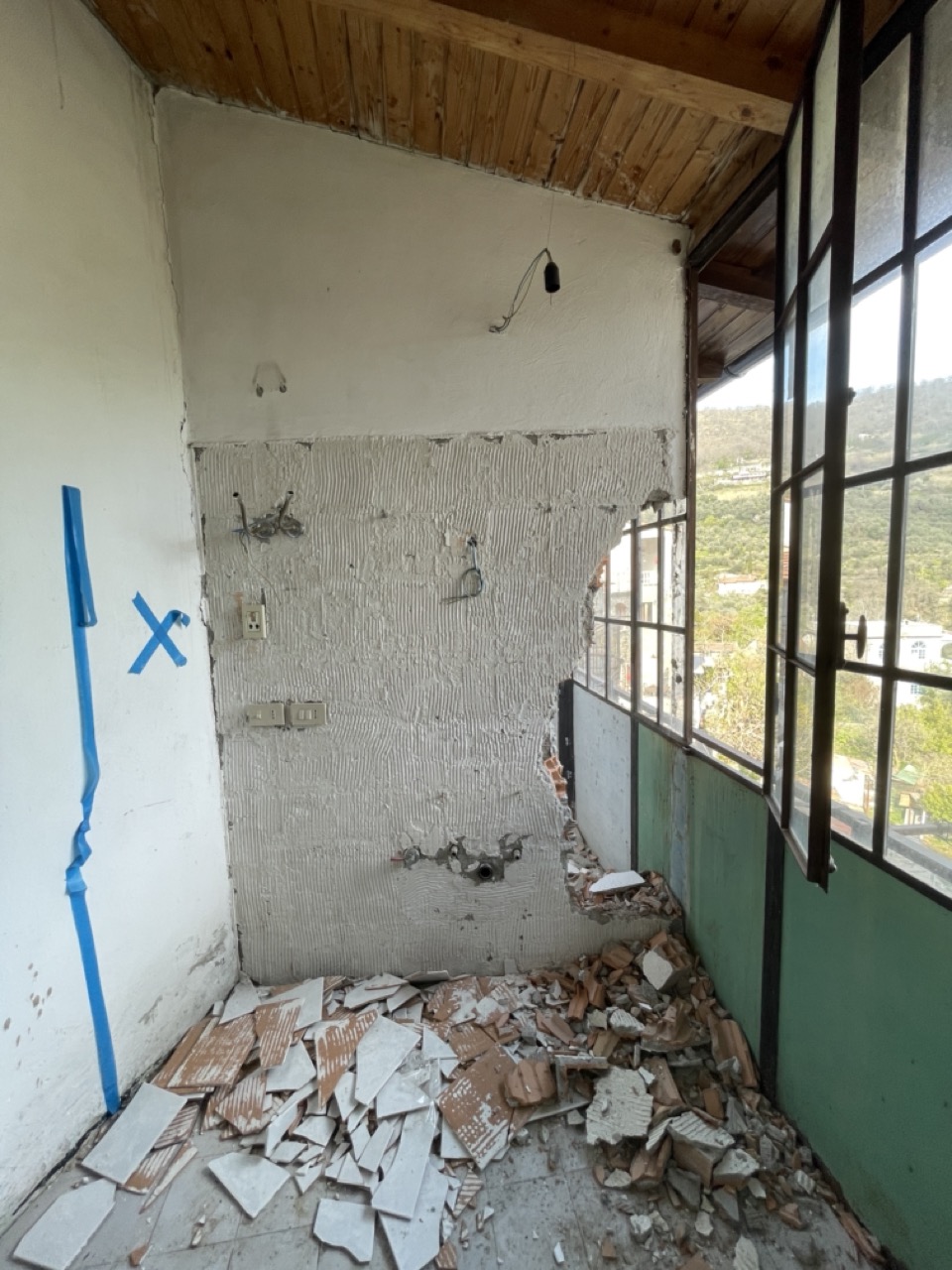 Väggen på verandan togs sakta ner och man fick en helt ny känsla av köksverandan som vi kallar den. Allt murbruk kånkas ner till källaren och töms i ett hål i golvet som jag hittat. Det rymmer hur mycket som helst...