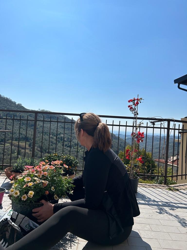 Catharina och Hedvig köpte växter och jord och krukor för att inreda terrassen med mera.